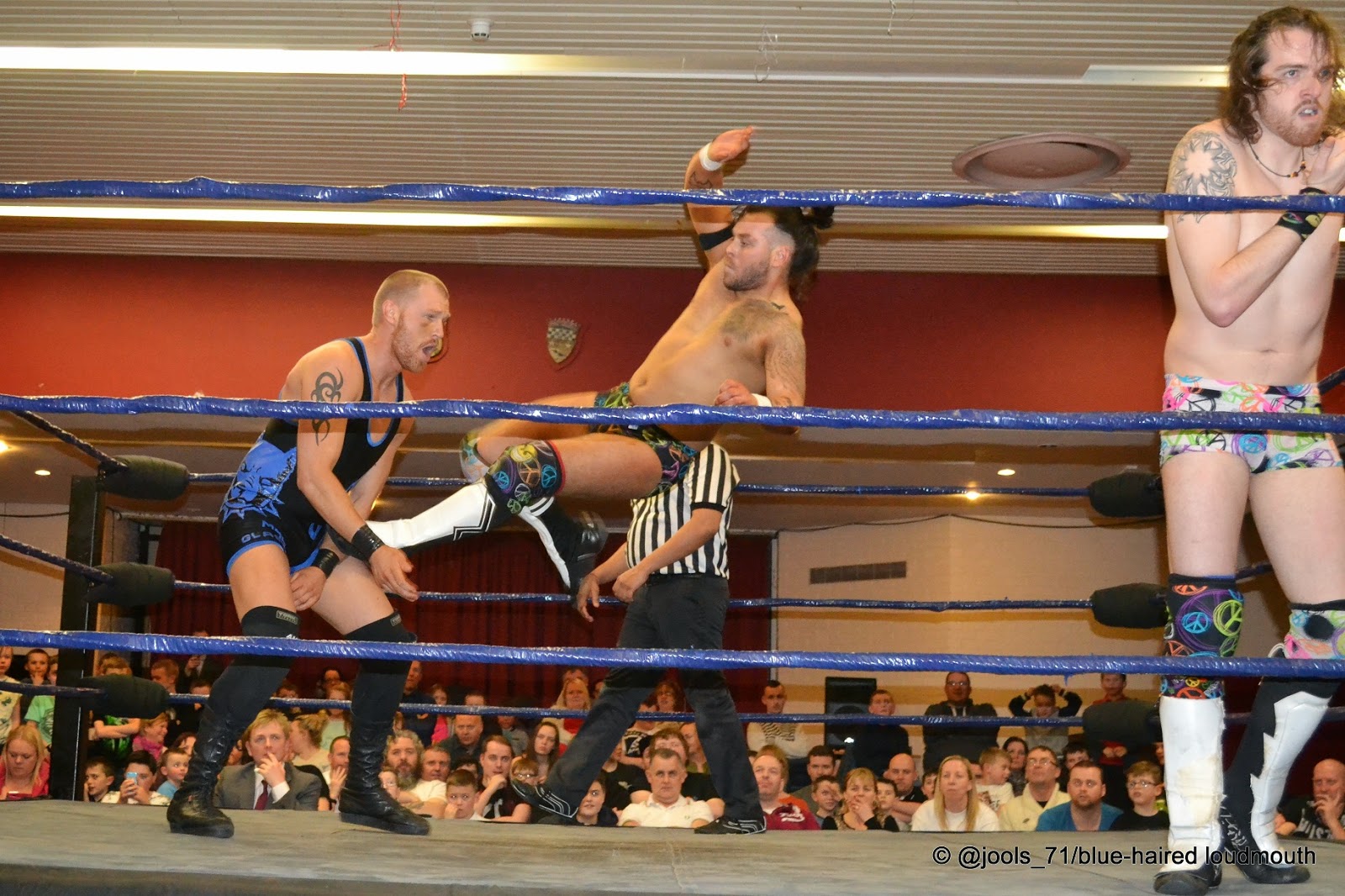 The penultimate match saw Aaron Echo face-off against Kenny Williams. I had only seen Echo once before in a pre-show match and I have to say that I saw a big improvement in his skills. While Williams dominated much of the match with his fast pace and aerial skills, Echo had a couple of cracking moments during the match, including a cracking suplex, and scored a couple of near pins. But as they say "Kenny is the bollocks" (loving the new ring gear) and it was Williams who took the victory in a really enjoyable match.